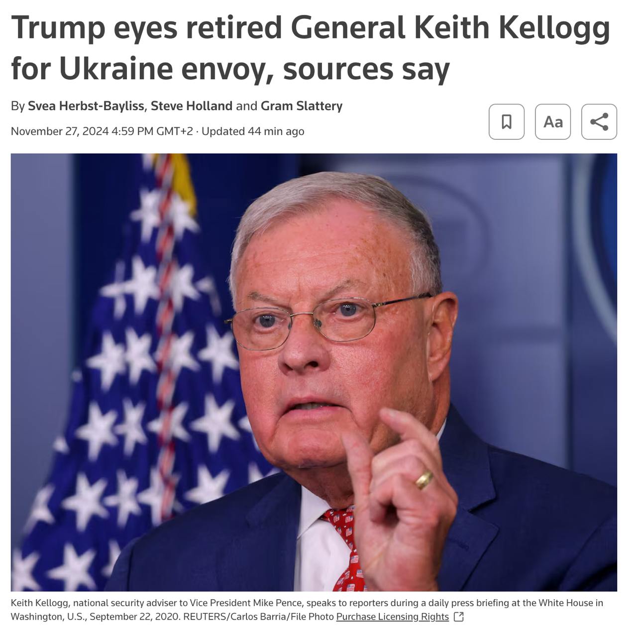 Избранный президент США Дональд Трамп может назначить специальным представителем по Украине 80-летнего Кита Келлога, отставного генерал-лейтенанта, который представил ему план прекращения войны.
