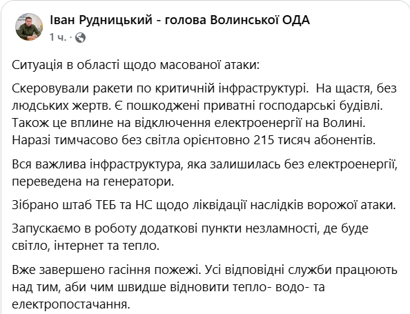 В Волынской области после ночного обстрела энергетики без света остались 215 тыс. домохозяйств. Об этом сообщает глава ОВА Иван Рудницкий.
