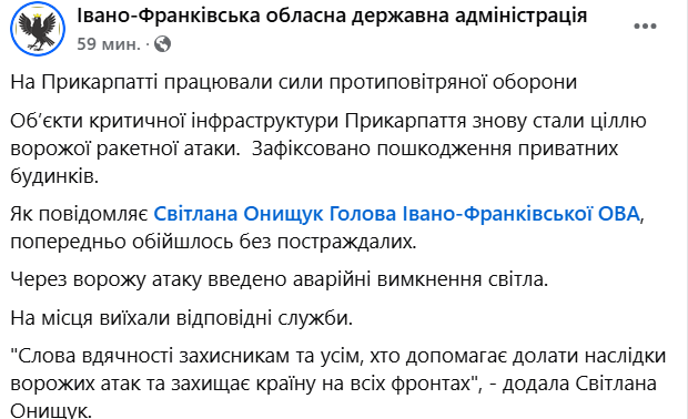 В Ивано-Франковской области также введены аварийные отключения света из-за прилетов по объектам критической инфраструктуры, сообщает ОВА.