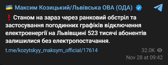 Во Львовской области без света остались более полумиллиона домохозяйств из-за массированного обстрела РФ. Об этом сообщает глава ОВА Максим Козицкий.