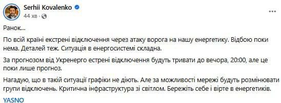 Напомним, сегодня утром россияне атаковали энергообъекты по всей Украине.
