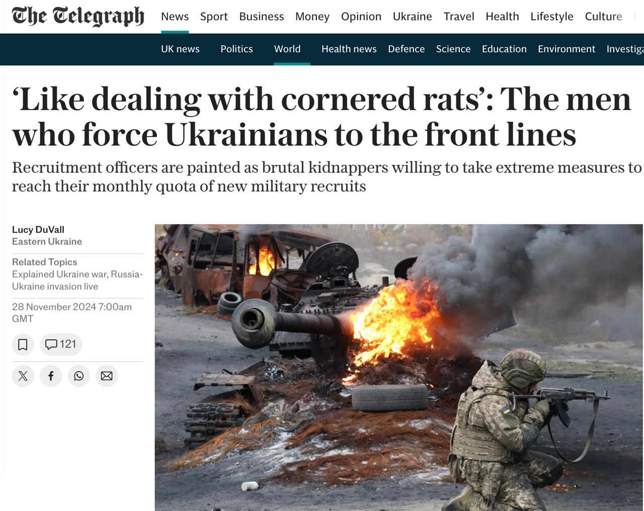 Сотрудник одного из украинских военкоматов рассказал The Telegraph, что из-за нехватки людей они стали задерживать всех подряд, чтобы выполнять норму по мобилизации.