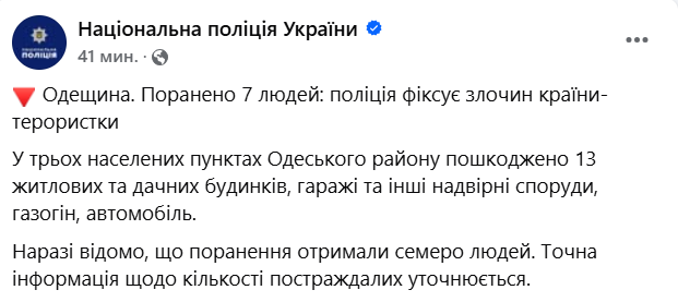 В Одесской области ранены 7 человек, сообщает Нацполиция. В трех населенных пунктах Одесского района повреждены 13 жилых и дачных домов, гаражи и другие дворовые постройки, газопровод, автомобиль.