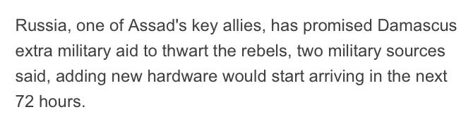 Заявляется, что новое военное оборудование начнет прибывать на подмогу армии Башара Асада в ближайшие 72 часа.