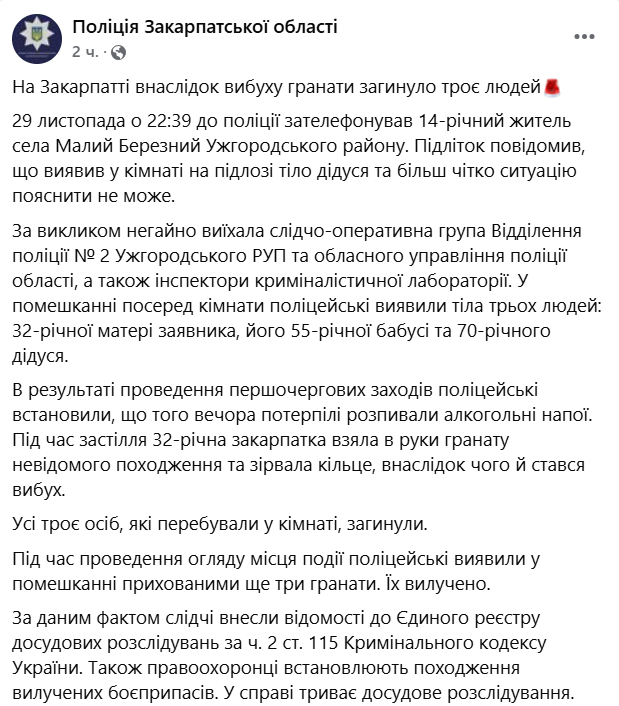 На Закарпатье от взрыва гранаты погибла семья. Фото: полиция