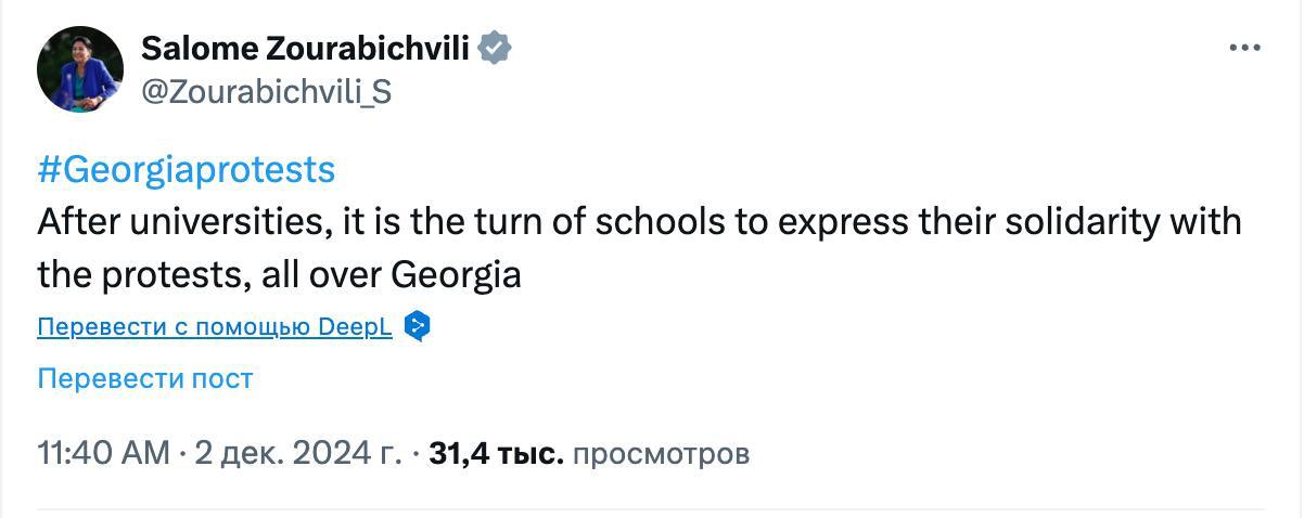 "После университетов настала очередь школ выразить свою солидарность с протестами по всей Грузии", - написала Зурабишвили.