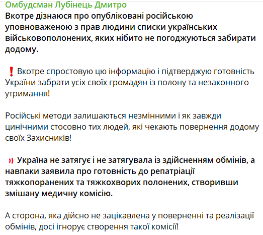 "Украина не затягивает и не затягивала с совершением обменов, а наоборот заявила о готовности к репатриации тяжелораненых и тяжелобольных пленных, создав смешанную медицинскую комиссию", – написал Лубинец в своем телеграм-канале.