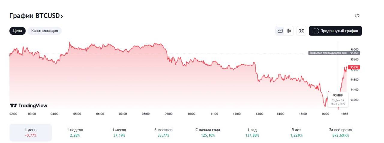 Утром котировки биткоина достигали $96,2 тыс., к полудню просели до $95,5 тыс., а к 16:30 из-за новостей из Южной Кореи случился провал до $93,9 тыс. Однако этим быстро воспользовались скупщики, которые начали откупать биткоин во время просадки цены, из-за чего курс сначала отскочил на $95,4 тыс., а затем корректировался на $95,2 тыс.