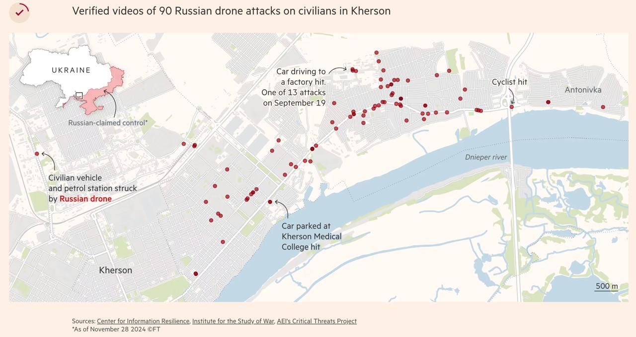 Сейчас же Херсон постоянно атакуют дроны, которые охотятся за гражданскими. Это ускорило выезд из города населения. По данным FT, из довоенных 250 тыс. осталось всего 60 тыс. В области - от миллиона осталось 158 тыс. человек.
