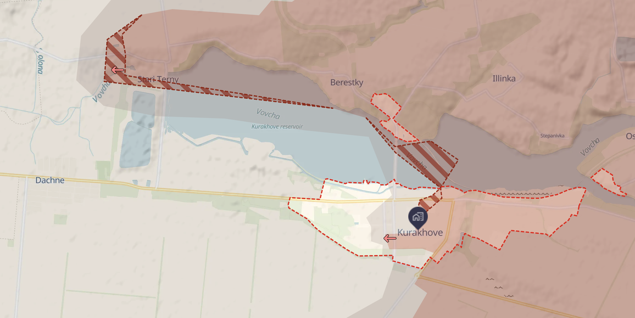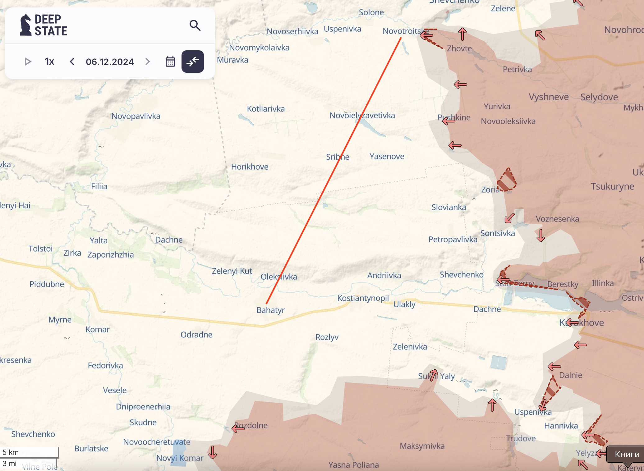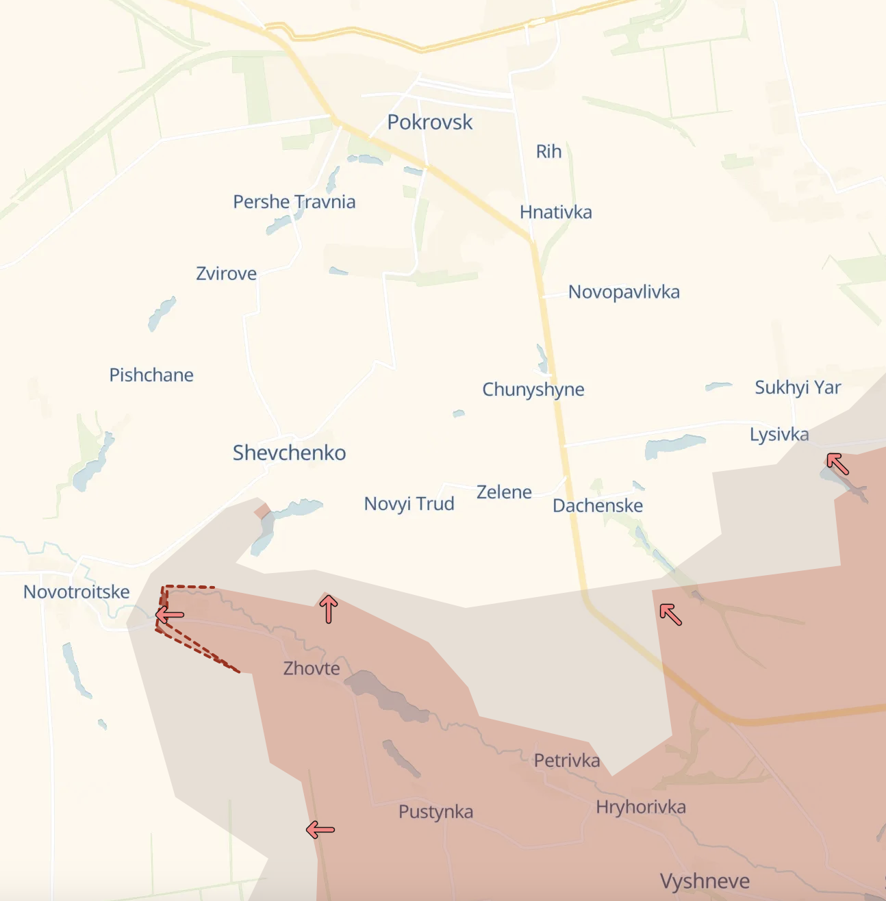 К югу от Покровска россияне подошли вплотную к селу Новотроицкое, захватив по пути деревню Новопустынка. Таким образом укрепляются позиции РФ у имеющего важное значение села Шевченко в трех километрах от Покровска, куда россияне прорвались накануне.