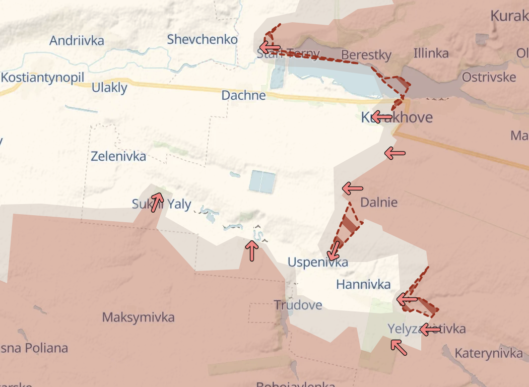 "На Кураховском направлении существует вполне реальная перспектива окружения всех наших войск восточнее условной линии Новотроицкое - Богатырь. Я не утрирую, западнее Селидово явно происходит "какая-то фигня". Причем очевидно, что противник не только ощутимо давит в сторону Покровска (через Новотроицкое и Шевченко), но и в сторону Украинки и Ясеново (а это явно происходит "с прицелом" на обход наших войск, обороняющихся в районе с. Заря и Сонцовка)", - сообщил Машовец.