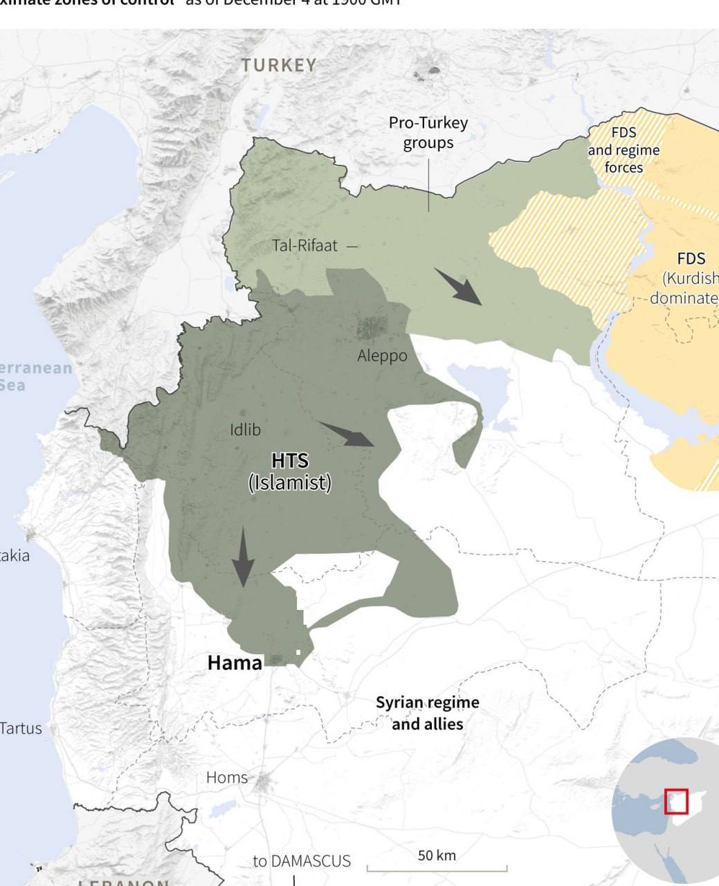 От Хама вооруженные отряды противников Асада быстро продвигаются к Хомсу. По сообщениям СМИ, они уже находятся в нескольких километрах от города и приближаются к его северным окраинам. А ряд источников сообщают, что они уже в самом городе.