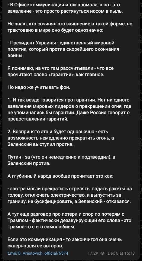 Он также раскритиковал опровержение Зеленским заявления Трампа о потерях ВСУ на уровне 400 тысяч человек. Арестович считает, что украинский лидер вступил в публичный спор с избранным президентом США "с его самолюбием".