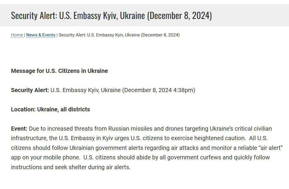 "В связи с возросшими угрозами со стороны российских ракет и беспилотников, нацеленных на критически важную гражданскую инфраструктуру Украины, посольство США в Киеве призывает граждан США проявлять повышенную осторожность. Все граждане США должны следить за оповещениями правительства Украины о воздушных атаках", – сказано в сообщении.