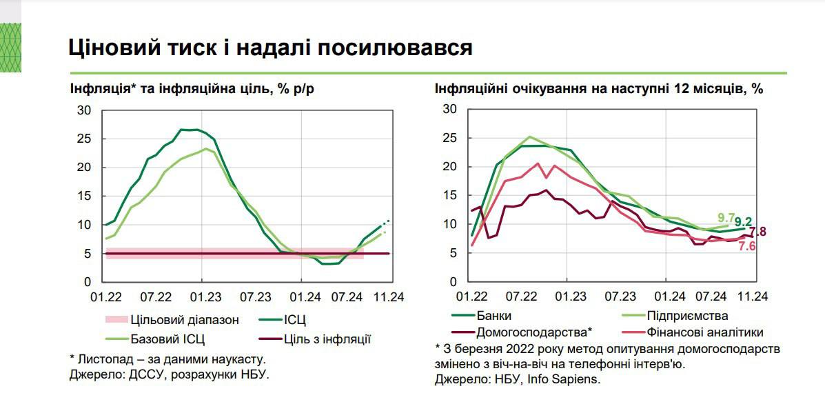 "Фактическая потребительская инфляция ускорилась (до 9,7% в годовом выражении) и превысила траекторию прогноза НБУ. Продовольственная инфляция выросла в результате более существенного, чем ожидалось, влияния неблагоприятных погодных условий на сельхозкультуры. Несколько быстрее, чем ожидалось, росли и административная инфляция, и цены на топливо. По оценкам Национального банка, рост цен продолжался и в ноябре", — сказано в этом документе.