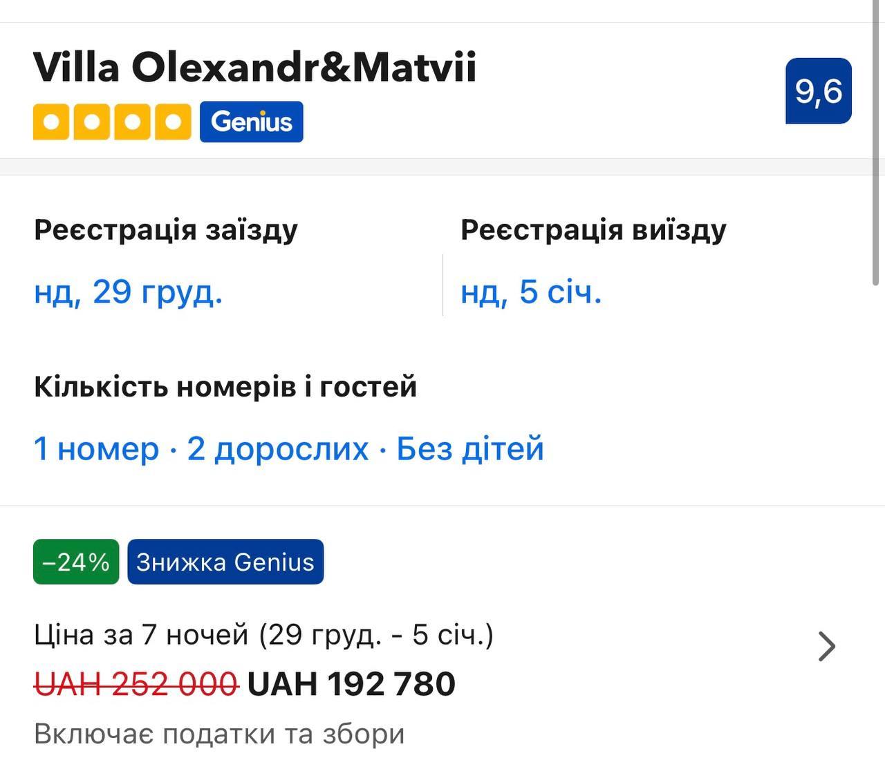 Шале Villa Olexandr&Matvii стоит 252 000 гривен без скидки и 192 780 гривен со скидкой.