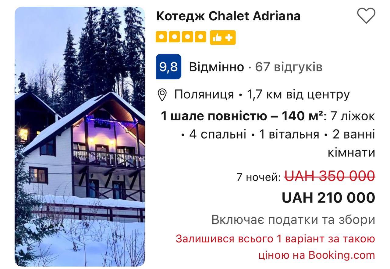 Аренда шале не дешевле гостиниц. Например, шале Chalet Adriana обойдется в 350 000 гривен за 7 ночей без скидки и 210 000 гривен со скидкой.