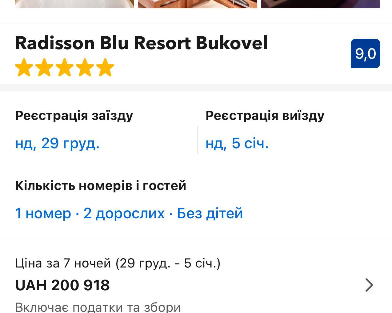 Так, стоимость семидневного проживания в отеле Radisson Blu Resort Bukovel на двоих составляет 200 918 гривен.