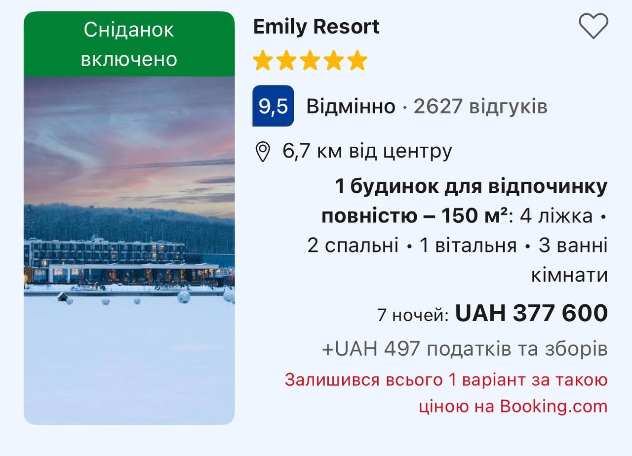 Кроме Буковеля, среди туристов также популярен курорт Emily Resort во Львовской области, где стоимость отдыха за 7 ночей составляет 377 600 гривен. Несмотря на высокие цены, свободных номеров на празднование Нового года в Emily Resort уже нет.