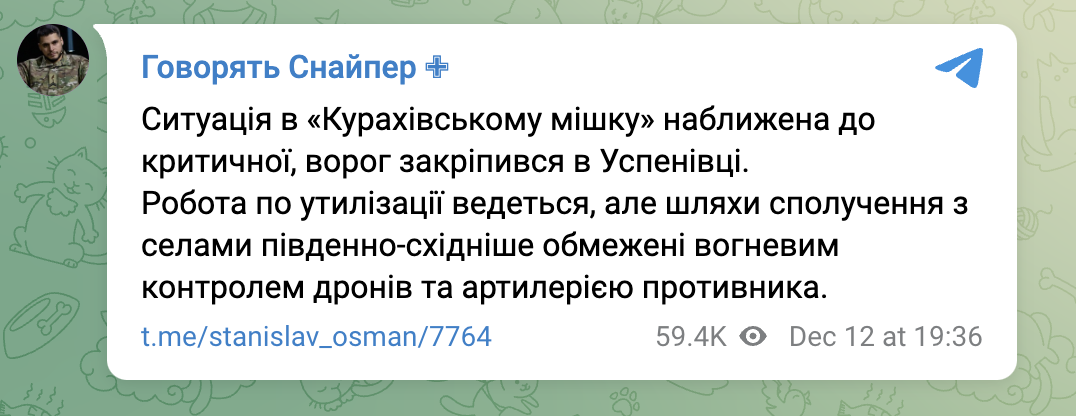 "Ситуация в "Кураховском мешке" приближена к критической, враг закрепился в Успеновке. Работа по утилизации ведется, но пути сообщения с селами юго-восточнее ограничены огневым контролем дронов и артиллерией противника", – написал он.