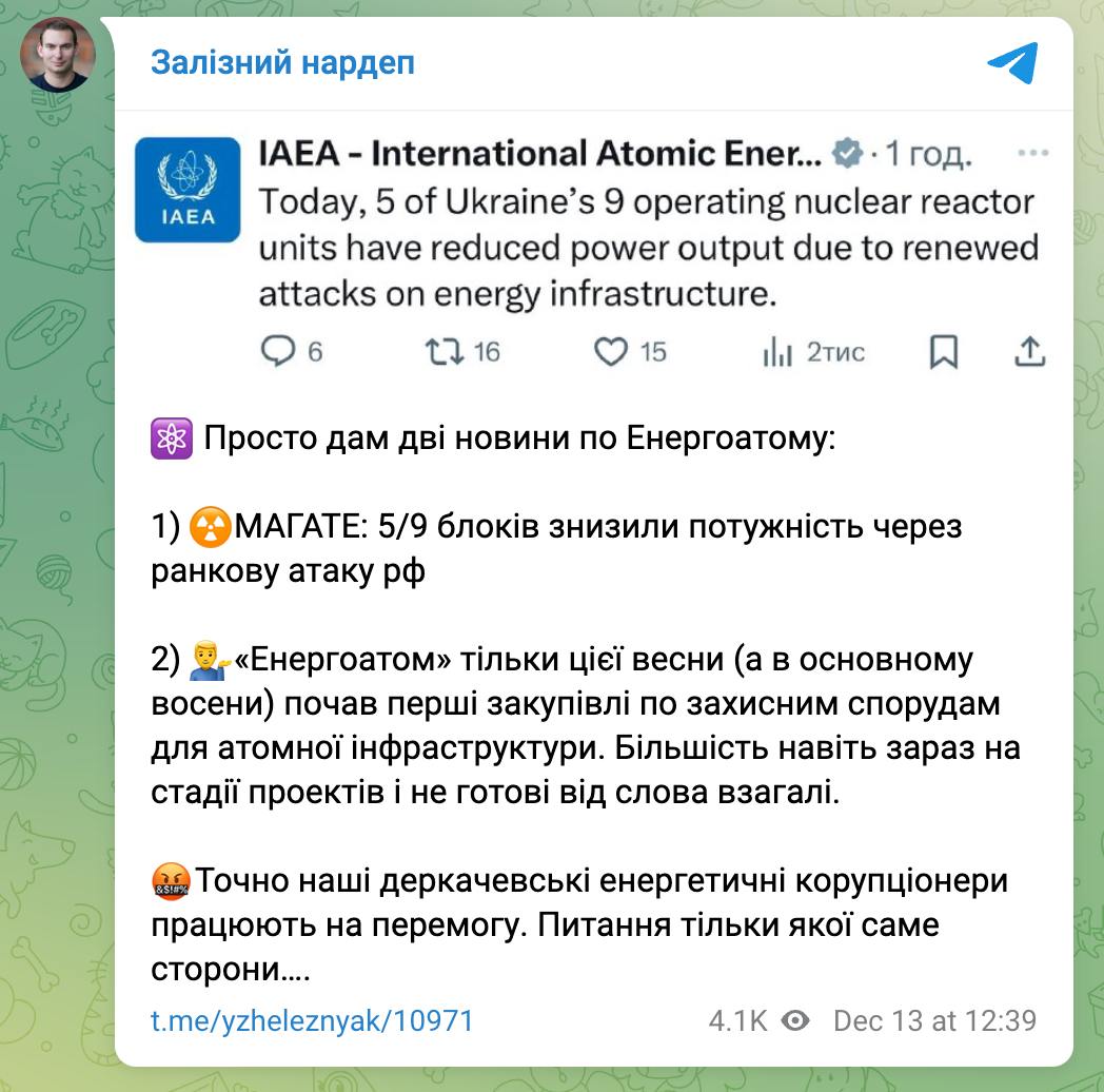 Сегодня 5 из 9 действующих ядерных реакторов снизили мощность из-за ракетной атаки. Фото: Facebook