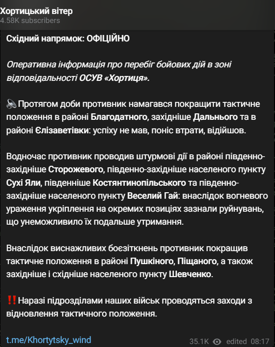 В то же время противник проводил штурмовые действия в районе юго-западнее Сторожевого, юго-западнее населенного пункта Сухие Ялы, южнее Константинопольского и юго-западнее населенного пункта Веселый Гай.