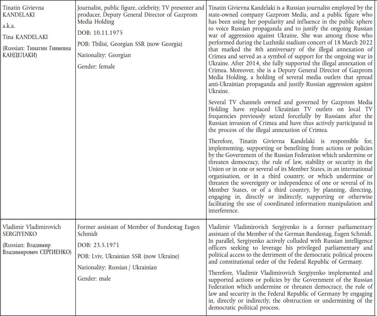 В частности, под санкции попали бывшая ведущая шоу "Самый умный", а ныне заместитель гендиректора "Газпром-медиа" Тина Канделаки, родившийся во Львове бывший помощник депутата Бундестага Владимир Сергиенко, российский политолог Тимофей Бордачев, певица Лариса Долина, офицеры ГРУ, ФСБ и сотрудница администрации Владимира Путина.