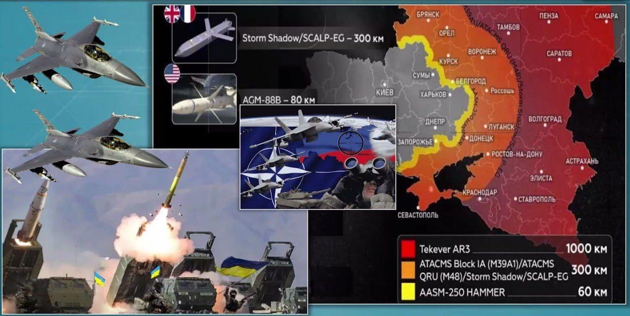 Так, американские ATACMS, британские Storm Shadow и французские ракеты Scalp покрывают всю захваченную территорию Украины, а также создают угрозу крупным российским городам и областным центрам – Белгороду, Брянску, Курску, Воронежу, Ростову и могут долететь до предместий Краснодара.