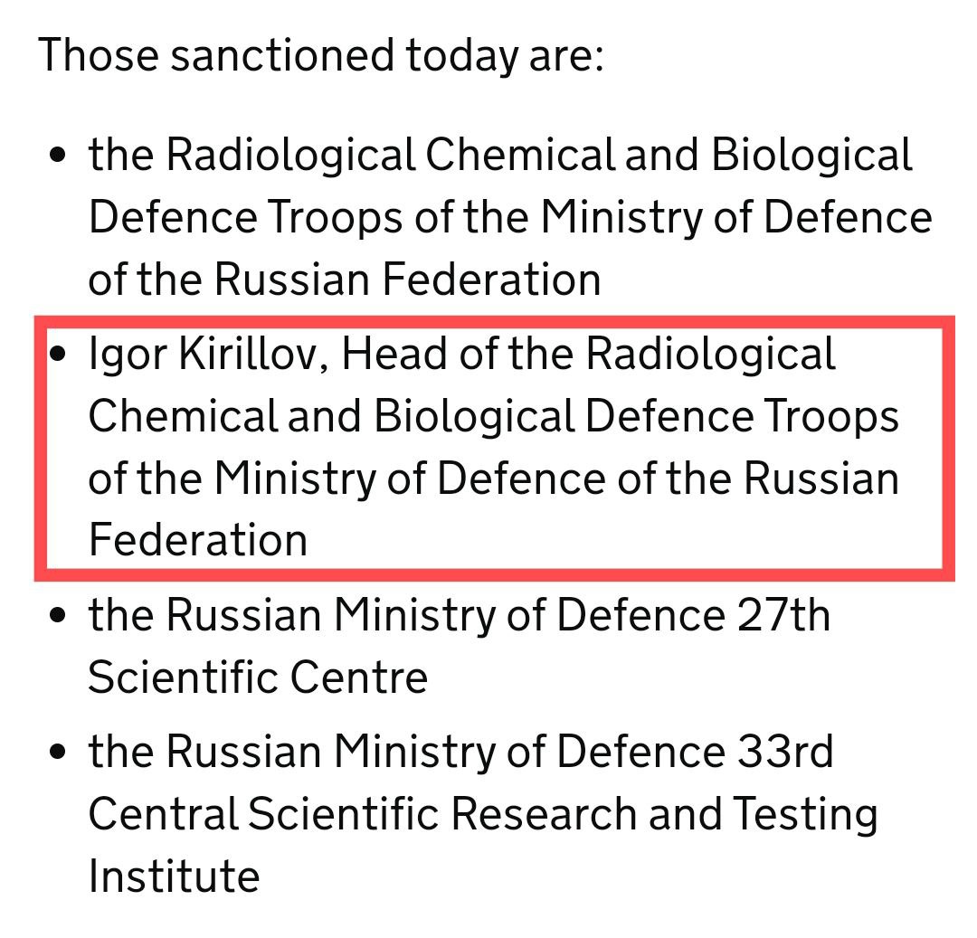 Кроме того, командующий войсками химзащиты РФ чуть более двух месяцев назад попал под санкции Британии.