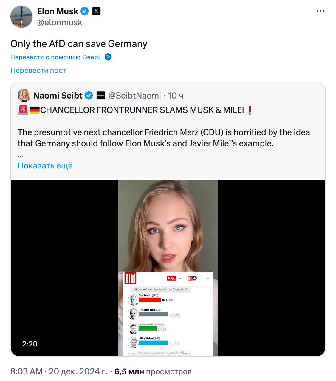 Так бизнесмен из команды избранного президента США Дональда Трампа прокомментировал ход предвыборной кампании в ФРГ и пост с критикой кандидата в канцлеры Фридриха Мерца из Христианско-демократического союза (ХДС) за нежелание формировать коалицию с "АдГ".