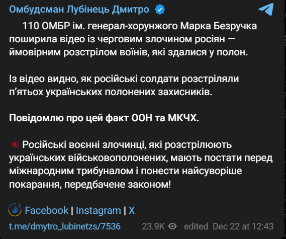 "Сообщу об этом факте ООН и МККК. Российские военные преступники, расстреливающие украинских военнопленных, должны предстать перед международным трибуналом и понести самое суровое наказание, предусмотренное законом!" – отреагировал на расстрел украинских военных омбудсмен Дмитрий Лубинец.