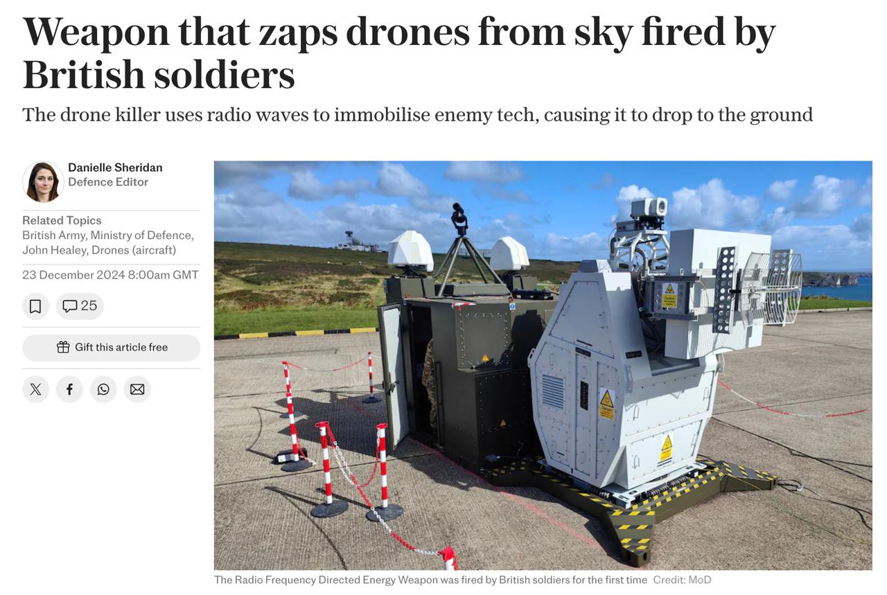 Армия Великобритании впервые применила энергетическое оружие, которое сбивает беспилотники "с помощью радиоволн". Оно называется RFDEW - радиочастотное направленное энергетическое оружие.