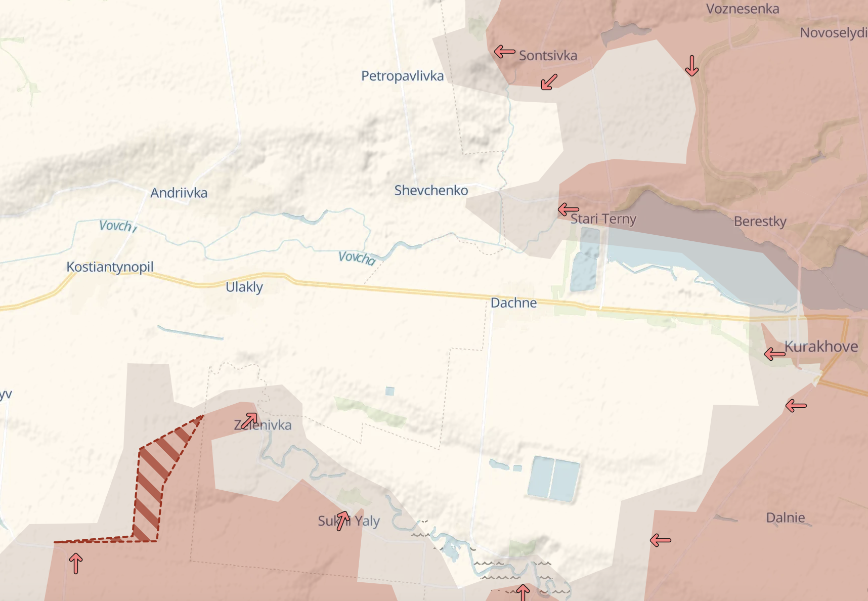 Россияне замкнули окружение вокруг Макаровки, что южнее Великой Новоселки, свидетельствует карта DeepState. Указано присутствие там украинских войск.