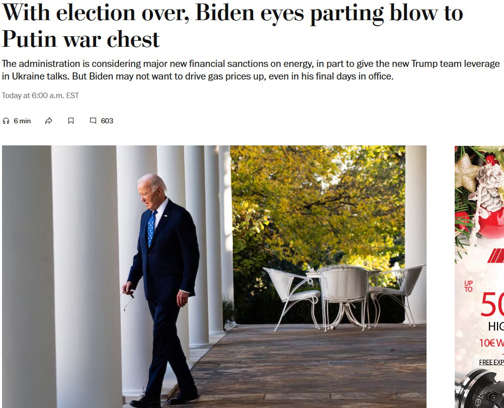 Президент США Джо Байден в последние недели своего пребывания у власти рассматривает возможность введения новых крупных санкций против российского энергетического сектора.