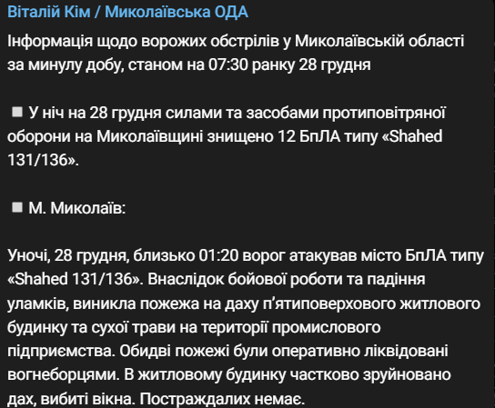 "В результате боевой работы и падения обломков возник пожар на крыше пятиэтажного жилого дома и сухой травы на территории промышленного предприятия", - написал Ким.