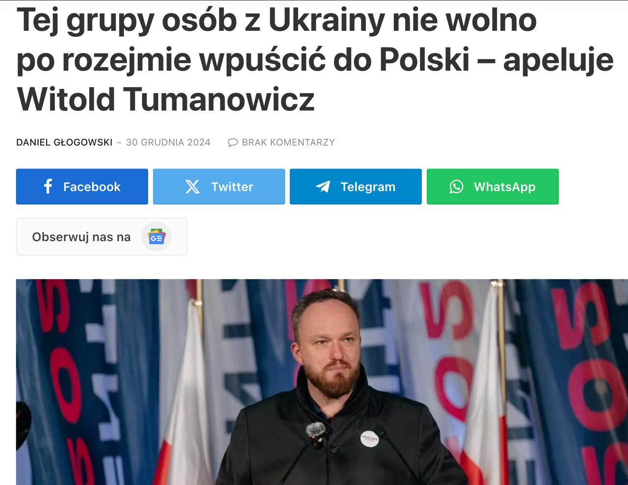 Депутат Конфедерации Витольд Туманович в эфире Polsat News заявил, что для Польши есть два приоритетных вопроса: во-первых, "ни одного польского солдата в Украине", а во-вторых, "обеспечить, чтобы в Польшу не приезжали регулярные украинские солдаты".