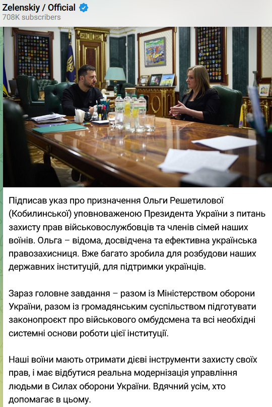"Ольга – известная, опытная и эффективная правозащитница. Уже многое сделала для развития наших государственных институций, для поддержки украинцев. Сейчас главная задача – вместе с Министерством обороны Украины, вместе с гражданским обществом подготовить законопроект о военном омбудсмене и все необходимые системные основы работы этого института", - сказано в публикации Зеленского.