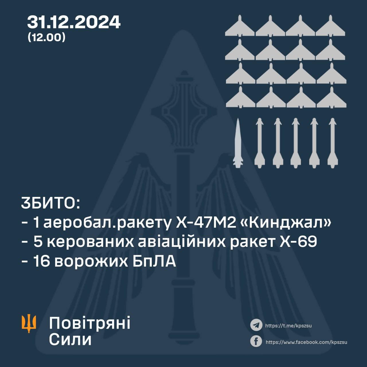 12.42 Воздушные силы сообщают, что этой ночью сбили 6 ракет из 21 и 16 "Шахедов" из 40. Еще 24 "локационно потеряны без негативных последствий".