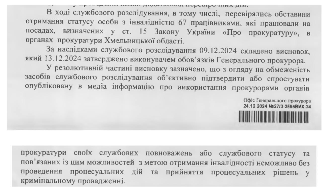 ЦПК направил запрос в Офис генпрокурора, чтобы узнать результаты служебного расследования: получили ли хмельницкие прокуроры инвалидность, пользуясь своими служебными полномочиями или статусом. Однако ведомство ответило, что не смогло доказать факт неправомерного получения инвалидности ни одного из 67 прокуроров Хмельницкой прокуратуры.