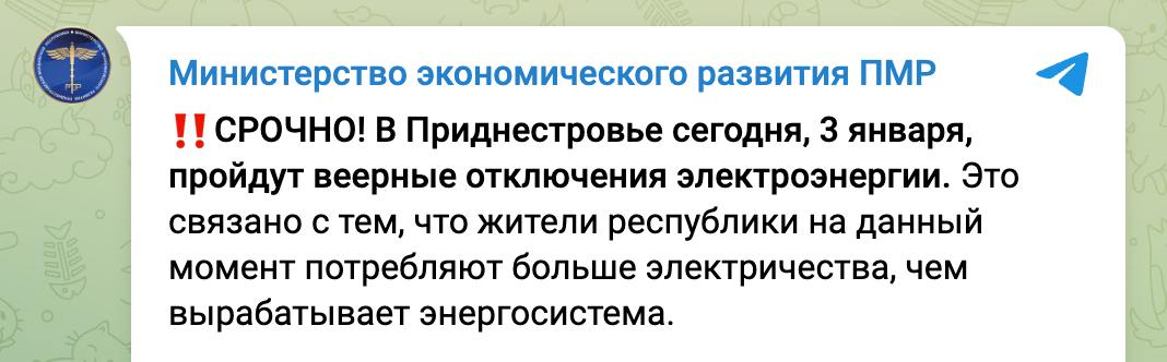 Между тем в Приднестровье ввели веерные отключения света из-за дефицита после прекращения поставок российского газа через Украину, сообщило "министерство экономического развития ПМР".