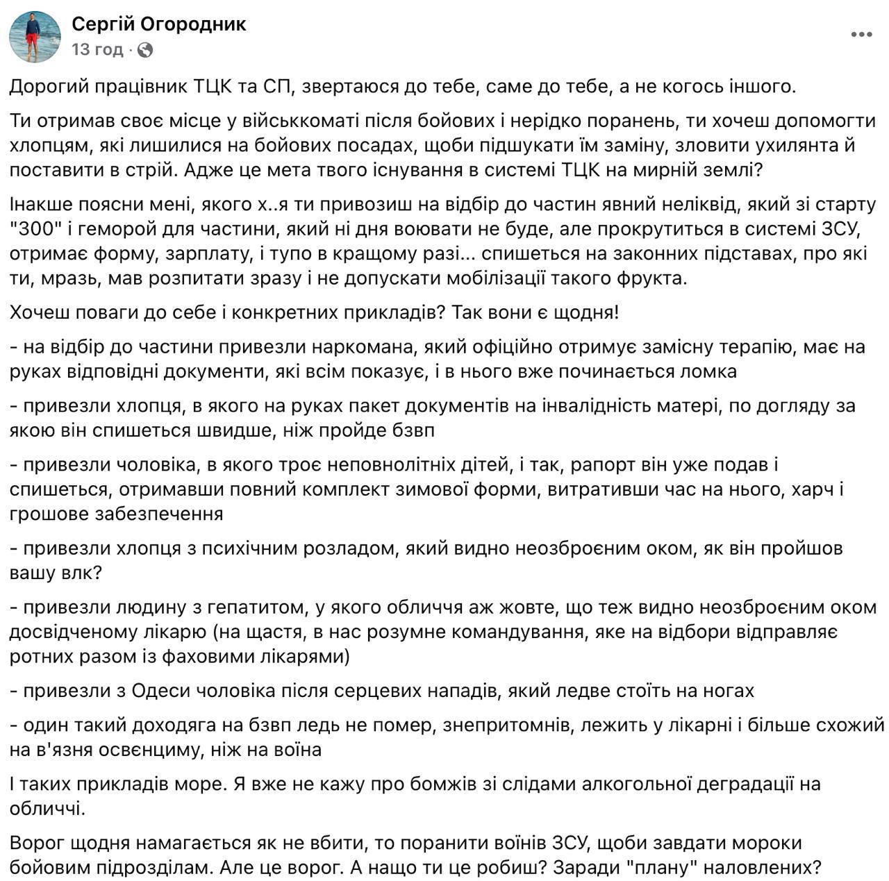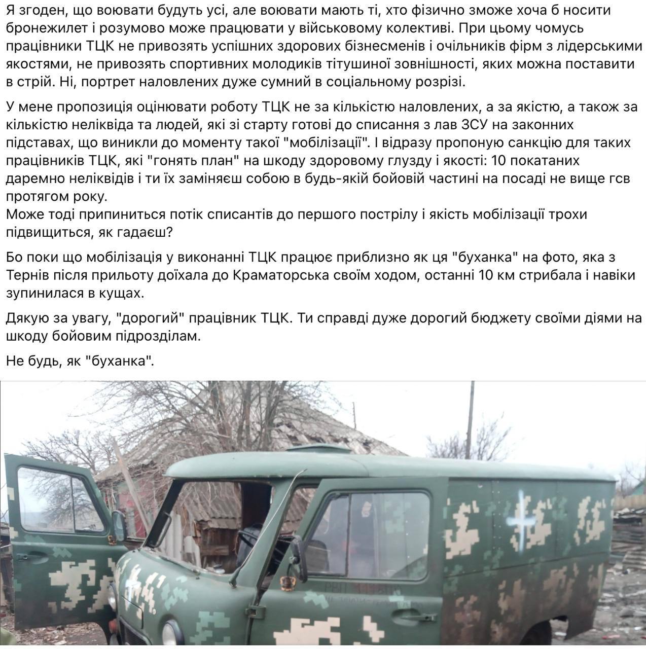 "Ты (сотрудник ТЦК – Ред.) привозишь на отбор в части явный неликвид, который со старта "300" и геморрой для части, который ни дня воевать не будет, но прокрутится в системе ВСУ, получит форму, зарплату и тупо, в лучшем случае, спишется на законных основаниях… При этом почему-то работники ТЦК не привозят успешных здоровых бизнесменов и руководителей фирм с лидерскими качествами, не привозят спортивных парней титушной внешности, которых можно поставить в строй", – написал он.
