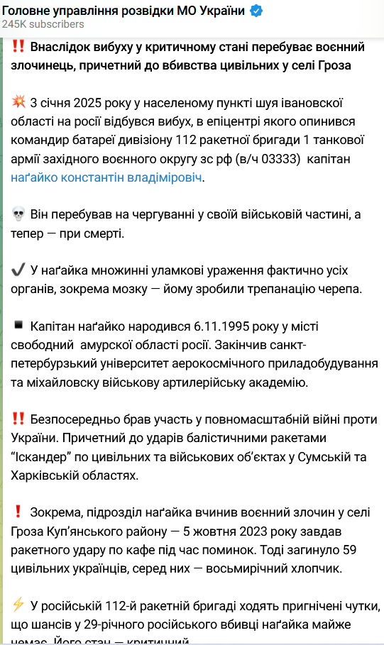 "В российской 112-й ракетной бригаде ходят подавленные слухи, что шансов у 29-летнего российского убийцы Нагайко почти нет. Его состояние - критическое", - говорится в сообщении.