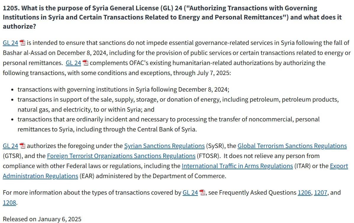 Речь идет о "сделках с правительственными учреждениями в Сирии после 8 декабря 2024 года, сделках в поддержку продажи, поставки, хранения или безвозмездной передачи энергоресурсов, включая нефть, нефтепродукты, природный газ и электроэнергию, в Сирию или на ее территорию, сделок, которые обычно происходят и необходимы для обработки перевода некоммерческих личных денежных переводов в Сирию, в том числе через ЦБ Сирии".