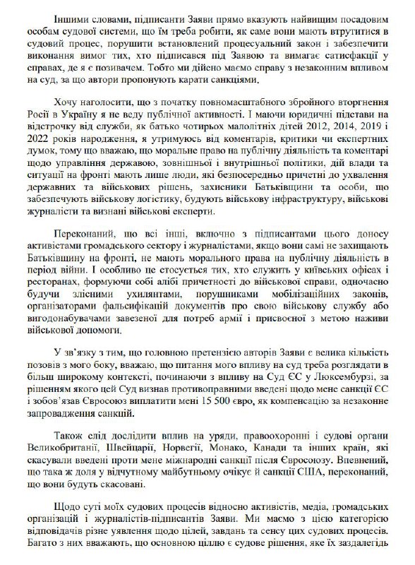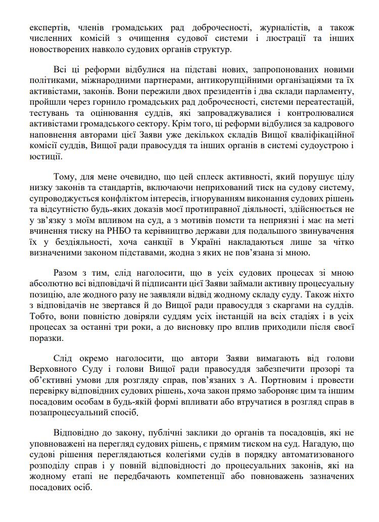 В ответ Портнов обвинил авторов заявления в давлении на судебную систему и отверг свое влияние на суды.