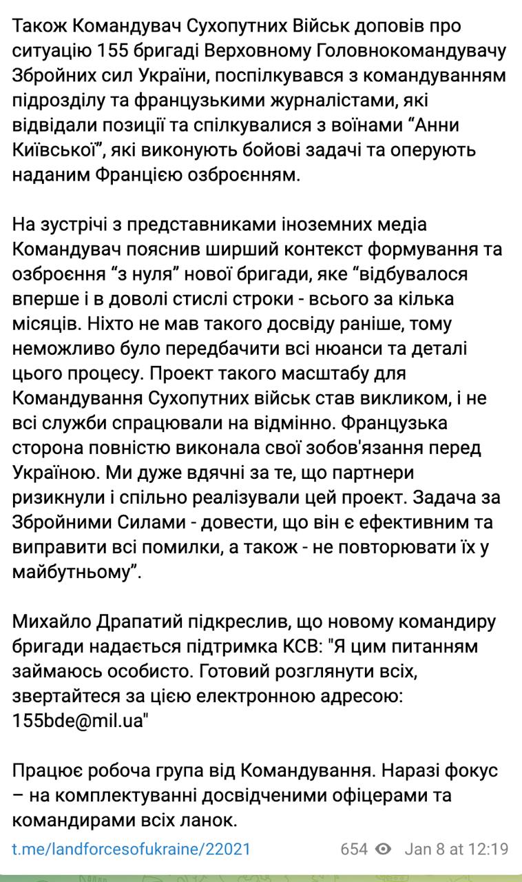 Между тем командующий Сухопутными войсками Михаил Драпатый прокомментировал массовое дезертирство из 155-й бригады. Он доложил президенту, что бригада формировалась "с нуля", это "происходило впервые и в довольно сжатые сроки – всего за несколько месяцев".