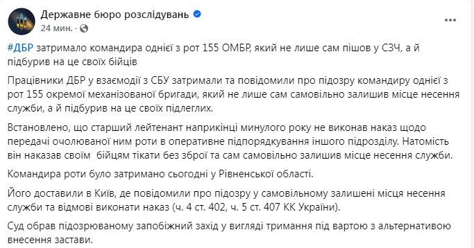 Государственное бюро расследование задержало командира одной из рот скандальной 155-й отдельной механизированной бригады "Анна Киевская", в отношении которой сейчас идет расследование касательно массовых случаев дезертирства.