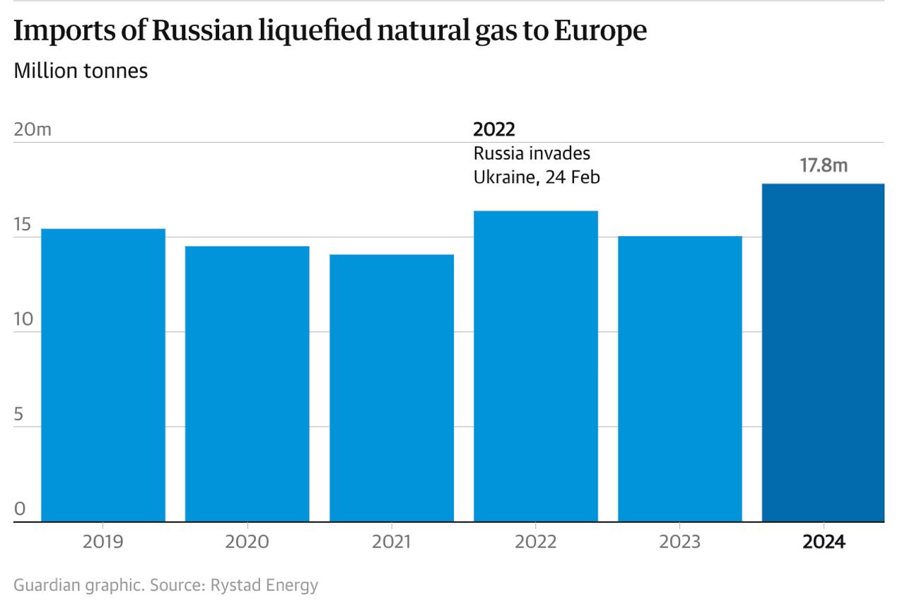 В 2024 году Европа закупила у России рекордное количество сжиженного природного газа - 17,8 млн тонн, что на 2 млн тонн больше, чем годом ранее.