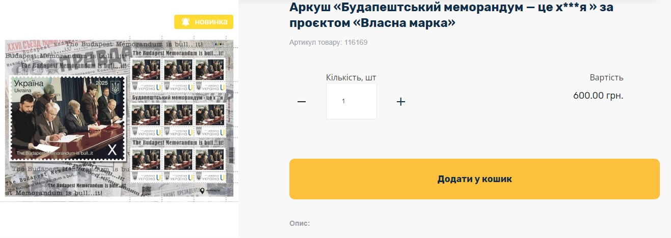 Лист "Будапештский меморандум — это ху@ня" по проекту "Собственная марка" стоит 600 гривен. Количество марок на листе — девять.