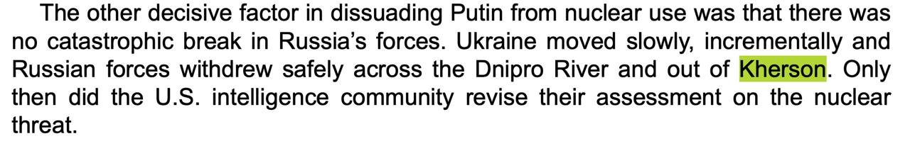 Но, исходя из повествования Вудворда, можно сделать предположение, что американцы, опасаясь применения ядерного оружия со стороны Путина, повлияли на украинское военно-политическое руководство, чтобы ВСУ дали россиянам возможность спокойно уйти из Херсона.