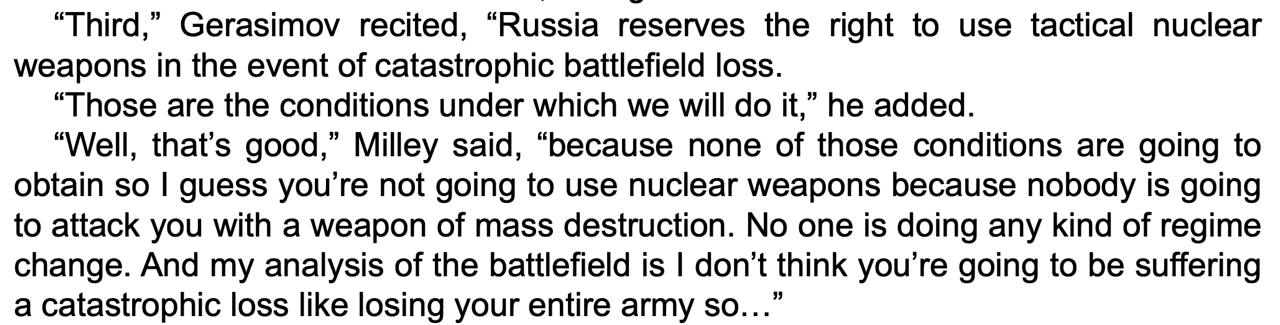 После этого Байден, по информации Вудворда, приказал на всех уровнях связаться с Россией и сделать все, чтобы не допустить ядерного сценария. Далее состоялся разговор между главами генштабов США и РФ Милли и Герасимовым. Герасимов заявил, что ЯО может быть применено в случае катастрофических потерь российских войск (что подходило под назревающие проблемы в Херсоне). На что Милли заверил, что такого поражения у России не будет.